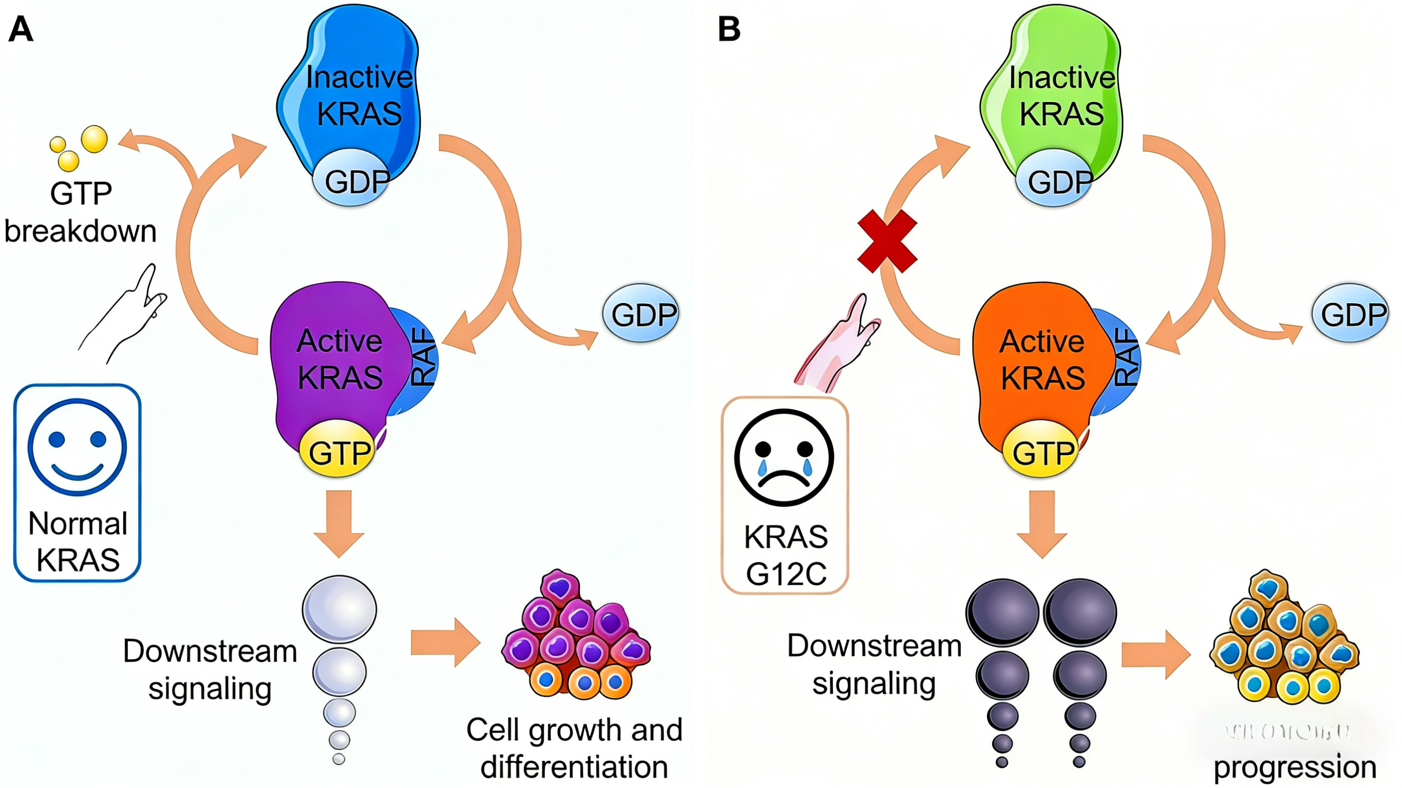 KRAS基因编码的蛋白是EGFR下游信号传导的核心节点,在生理状态下通过GDP/GTP结合切换处于失活与激活的动态平衡。当KRAS基因发生突变时,GTP酶激活蛋白(GAP)介导的GTP水解过程受阻,导致KRAS蛋白持续处于GTP结合的活化构象,异常激活下游MAPK和PI3K信号通路,驱动肿瘤细胞增殖与存活。即使上游EGFR信号被抗体药物阻断,突变型KRAS仍能独立维持通路激活,从而介导对西妥昔单抗和帕尼单抗的耐药。基于这一机制,国内外临床指南均推荐仅在KRAS野生型转移性结直肠癌患者中使用抗EGFR单抗治疗。