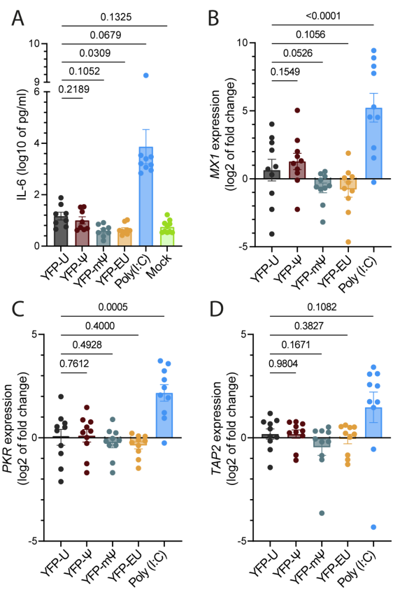 对干扰素通路下游基因MX1,以及免疫相关基因PKR与TAP2的转录水平分析进一步证实了这一点。未修饰及Ψ修饰mRNA能一定程度诱导MX1表达上调,而EU与m1Ψ修饰mRNA则未引起明显变化。对于PKR与TAP2,EU与m1Ψ修饰同样未显示激活效应,甚至略有抑制。这些数据一致表明,EU修饰与m1Ψ相似,能有效规避由mRNA触发的固有免疫识别通路。