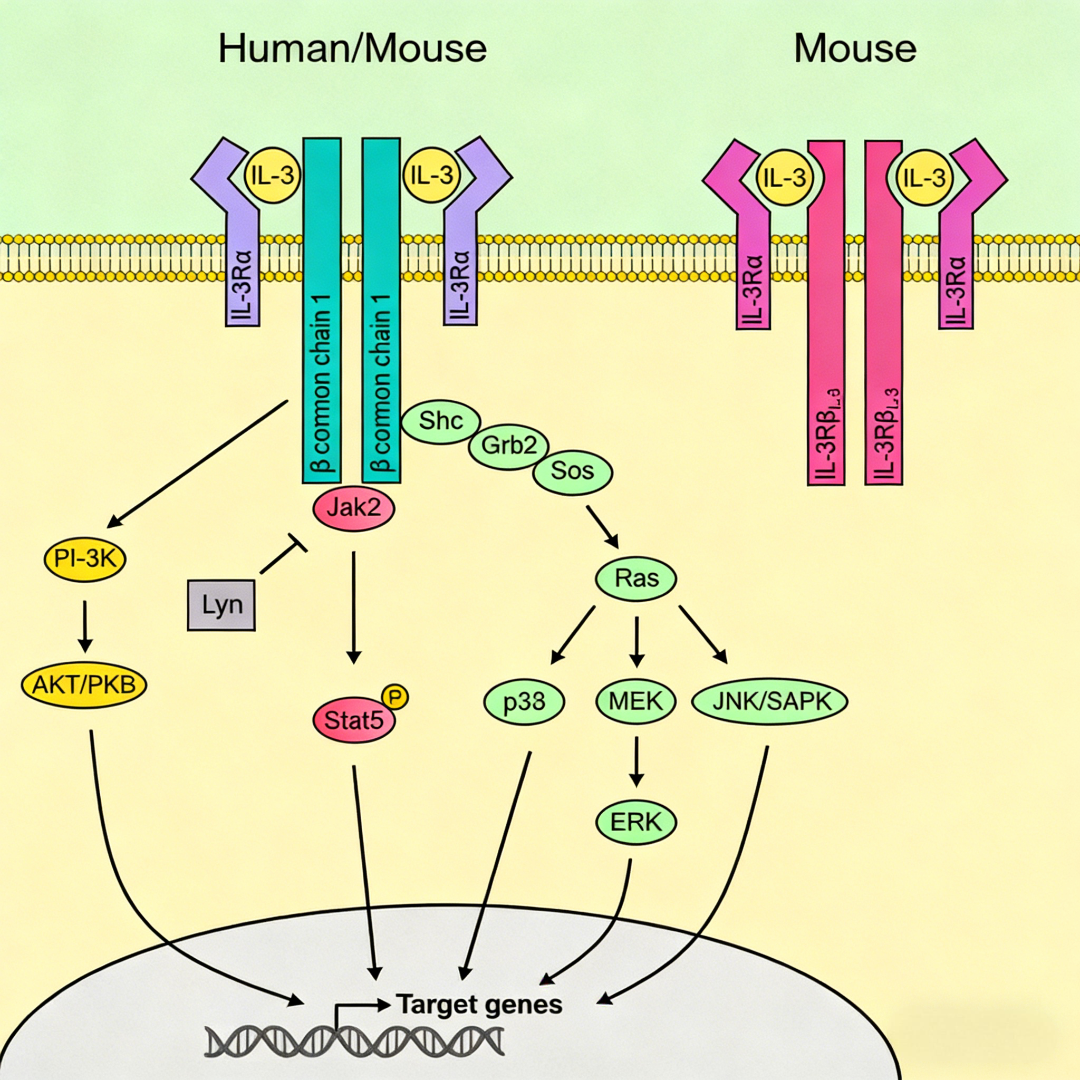 最新研究揭示了这一调控过程的核心机制:IL-3R的α与βc亚基在细胞表面的相对表达比例,直接决定了受体的高阶组装形式,进而编码了不同的生物学指令。