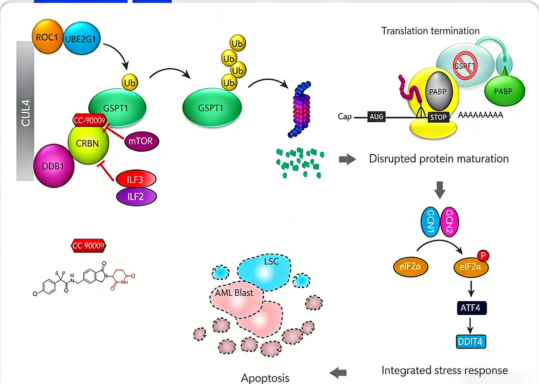 目前针对GSPT1的药物开发主要采用蛋白降解策略,尤其是利用CRL4CRBN E3泛素连接酶系统诱导其泛素化与蛋白酶体降解。该策略相较于传统抑制剂具有可作用于"不可成药"靶点、作用持久等优势。已有多家国际药企布局该领域,早期候选分子如CC-90009在临床前与早期临床研究中展现出抗肿瘤活性,但后续研发亦面临选择性、耐药性及实体瘤疗效不足等挑战。