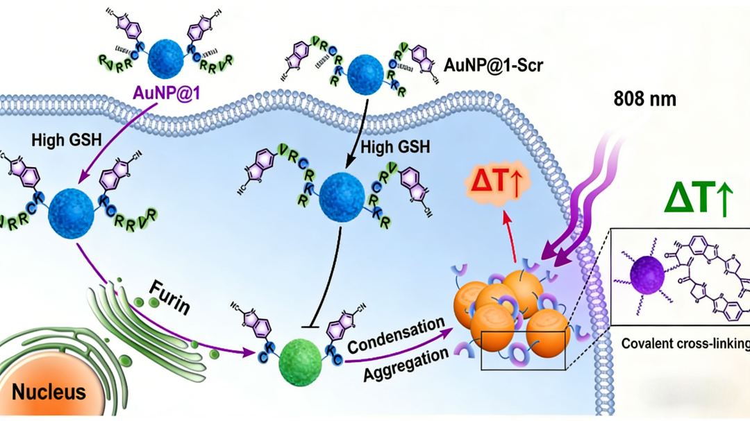 弗林蛋白酶(Furin,亦称PCSK3)是一种在多种恶性肿瘤(如乳腺癌、肺癌等)中高表达的转化酶,其活性在肿瘤组织中显著上调,是理想的肿瘤微环境响应性生物标志物。基于此,安徽师范大学王广凤教授与中国科学技术大学梁高林教授团队,创新性地设计并构建了一种Furin酶响应的智能型金纳米平台,实现了肿瘤细胞内酶控的AuNPs聚集,从而显著增强了光热治疗效果。