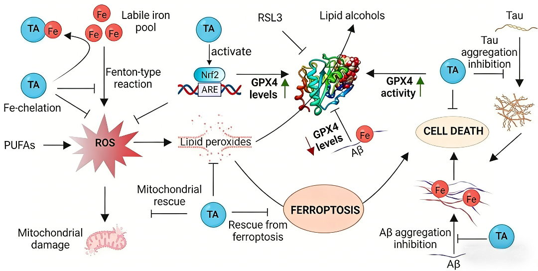 4. 协同作用机制整合:TA通过多管齐下的方式发挥保护作用:① 螯合铁离子,减少铁死亡触发因素;② 清除自由基,减轻氧化损伤;③ 抑制Aβ和Tau病理聚集;④ 直接增强GPX4这一细胞内关键的抗氧化防御酶活性。这种"开源节流"(减少损伤输入、增强防御输出)的协同机制,使其成为对抗AD中复杂的神经退行性病变和铁死亡的理想候选分子。