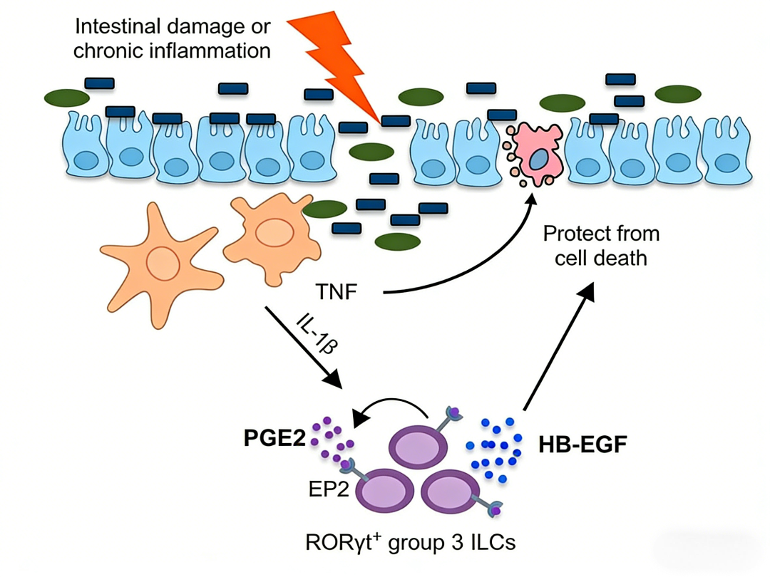 本研究首次系统地揭示了ILC3s通过感知IL-1β炎症信号,经PGE2-EP2自分泌环路,上调并分泌HB-EGF蛋白,进而激活肠上皮细胞的EGFR-Akt生存通路,从而对抗TNF介导的肠道损伤与炎症。这一机制在急、慢性结肠炎模型中均被证实具有重要的保护作用。