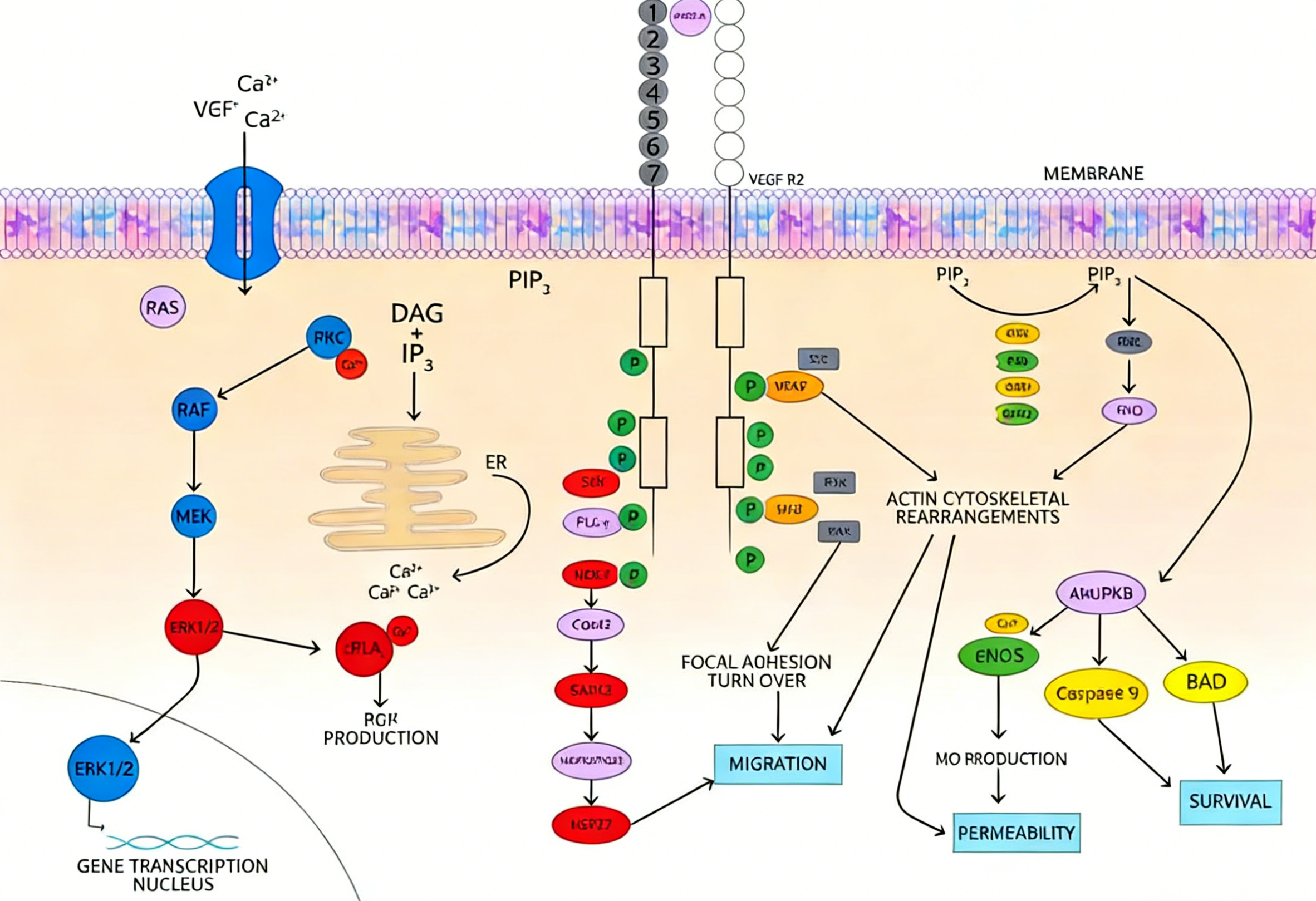 VEGF(以VEGFA为主)与VEGFR-2结合后,引发受体二聚化及自磷酸化,进而募集并激活多种下游信号分子,形成三条主要效应通路: