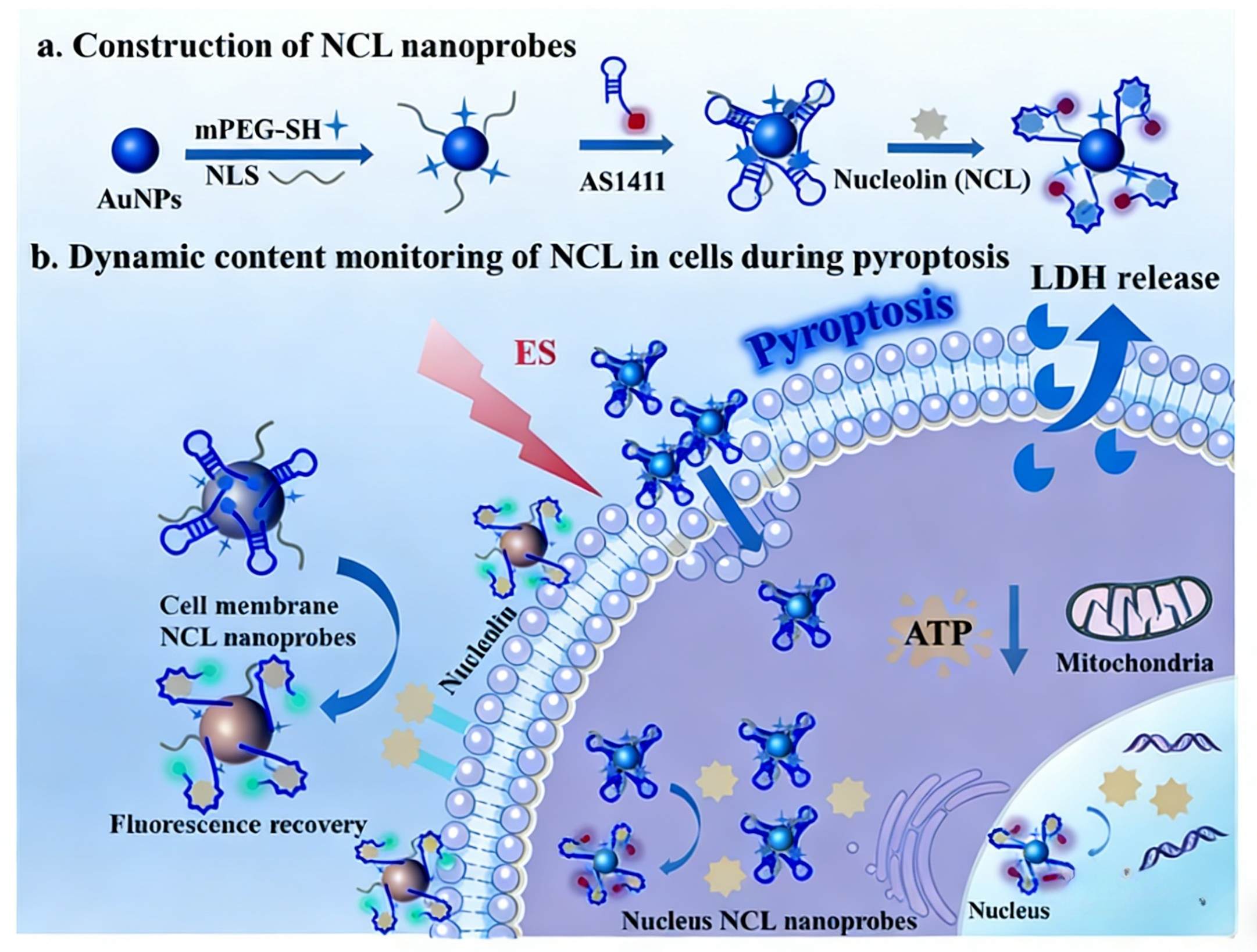 核仁素(Nucleolin,NCL)是一种多功能核蛋白,其在细胞核仁、细胞质及细胞膜上均有分布,并参与调控rRNA合成、细胞周期进程、细胞增殖与凋亡等关键生物学过程。在多种肿瘤细胞中,核仁素呈现显著过表达,并常易位至细胞膜表面,成为肿瘤特异性诊断和靶向治疗的重要潜在标志物。然而,传统的核仁素检测方法(如免疫印迹、免疫荧光染色)通常依赖细胞裂解或固定,难以实现活细胞内核仁素的原位、实时、动态监测。因此,开发一种能够在单细胞水平上对核仁素进行高灵敏度、高特异性、亚细胞定位动态追踪的活细胞成像工具,对于理解其在生理病理过程中的功能、以及推动基于核仁素的精准诊疗策略至关重要。