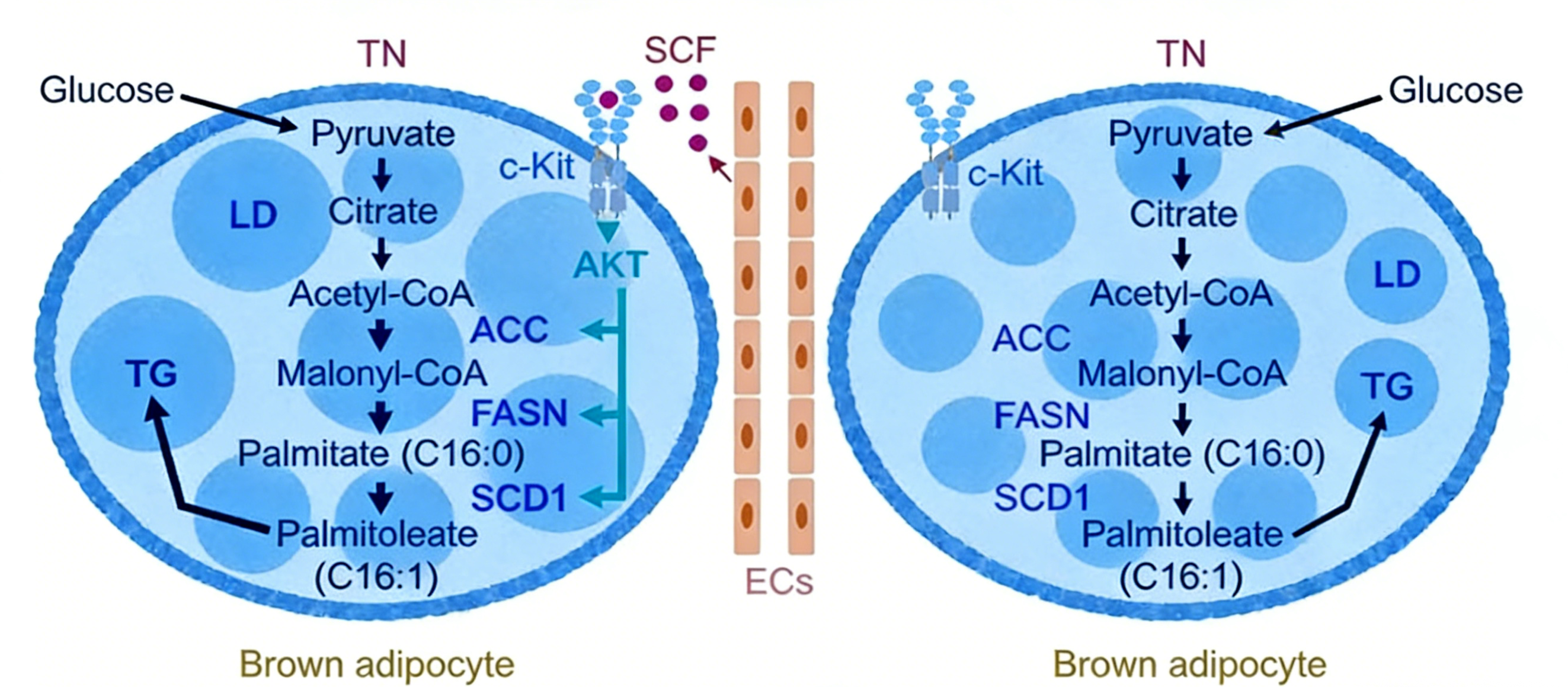 棕色脂肪组织是哺乳动物体内重要的产热器官,通过非颤抖性产热过程消耗葡萄糖和脂肪酸,对维持能量代谢平衡、抵抗肥胖及相关代谢疾病具有关键作用。棕色脂肪组织具有高度血管化的特征,其功能受到交感神经和局部微环境的精细调控。内皮细胞作为血管壁的主要构成部分,不仅是物质交换的屏障,更被视为重要的旁分泌细胞,通过与脂肪细胞相互作用调节组织功能。干细胞因子及其受体酪氨酸激酶c-Kit在多种生理过程中扮演重要角色,已有研究表明其在代谢组织(如胰腺)的发育和功能维持中不可或缺,并且其表达水平与肥胖状态呈负相关。然而,内皮细胞是否通过分泌SCF与棕色脂肪细胞交流,并具体如何调控后者的脂质代谢与能量稳态,尚不明确。