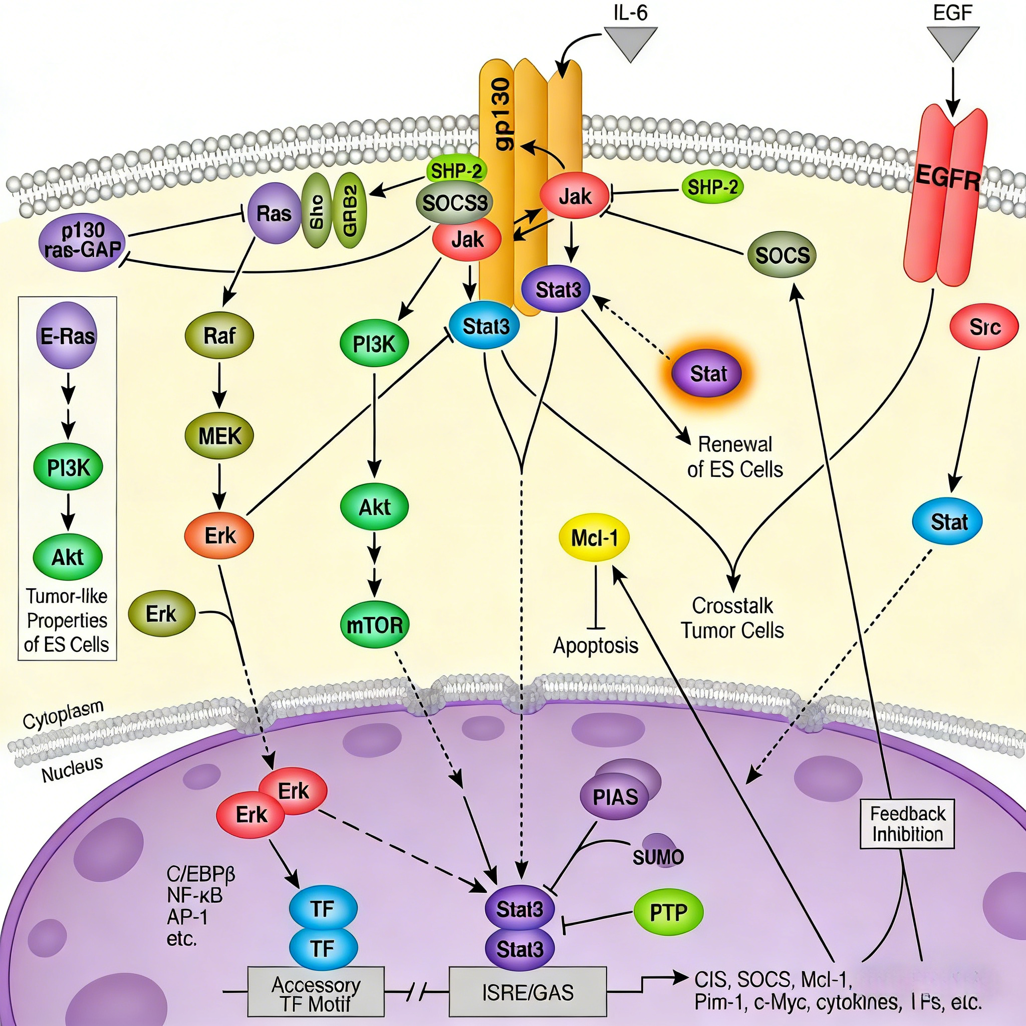 无论何种模式,最终均导致JAK激酶的激活,进而磷酸化并激活STAT3。活化的STAT3形成二聚体,转位至细胞核内,调控下游靶基因的转录。该通路受到细胞因子信号抑制因子等蛋白质的负反馈精细调控,以确保信号适时终止。