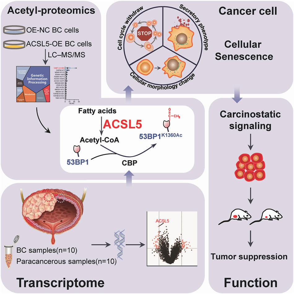 ACSL5 促进脂肪酸氧化(FAO),减少细胞内脂质积累,同时增加乙酰辅酶A(Acetyl-CoA) 水平;乙酰辅酶A 促进蛋白质乙酰化从而诱导细胞衰老。