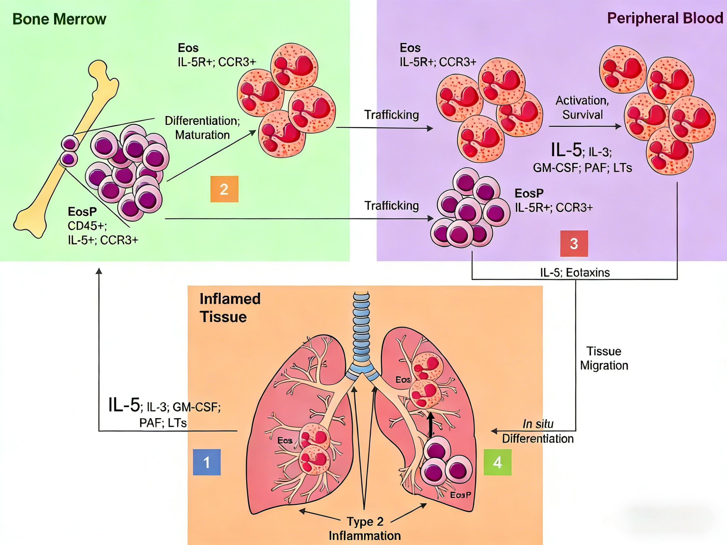 2. 延长存活周期:通过抑制凋亡信号,IL-5显著延长成熟嗜酸性粒细胞的生存时间;