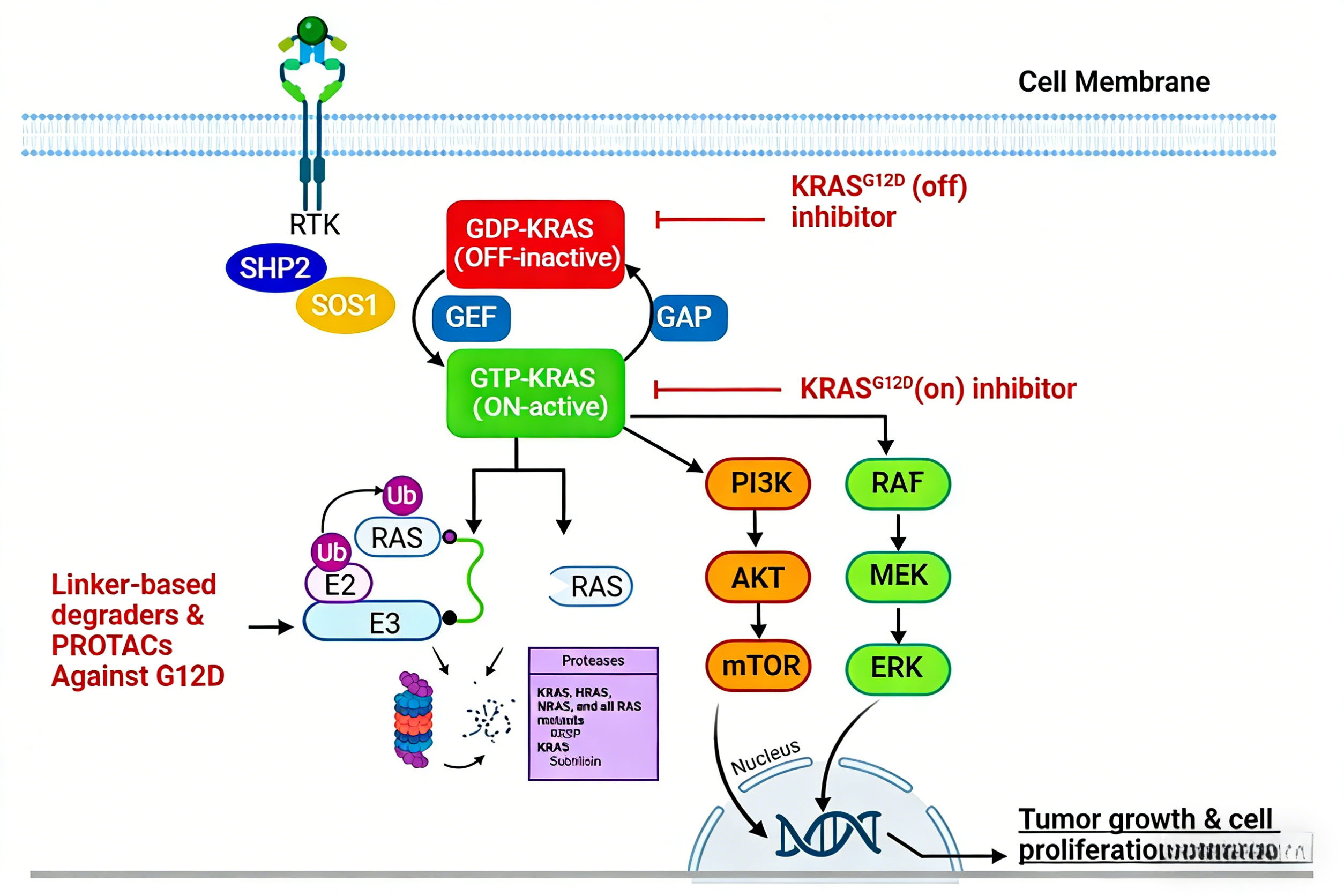 KRAS蛋白作为细胞内信号传导的关键节点,在生理状态下通过结合GDP或GTP切换失活与激活状态。当发生G12D致癌突变时,KRAS蛋白的GTP水解过程受阻,导致其持续处于GTP结合的活化构象,异常激活下游RAF/MEK/ERK和PI3K/AKT/mTOR等信号通路,驱动肿瘤细胞的增殖与存活。