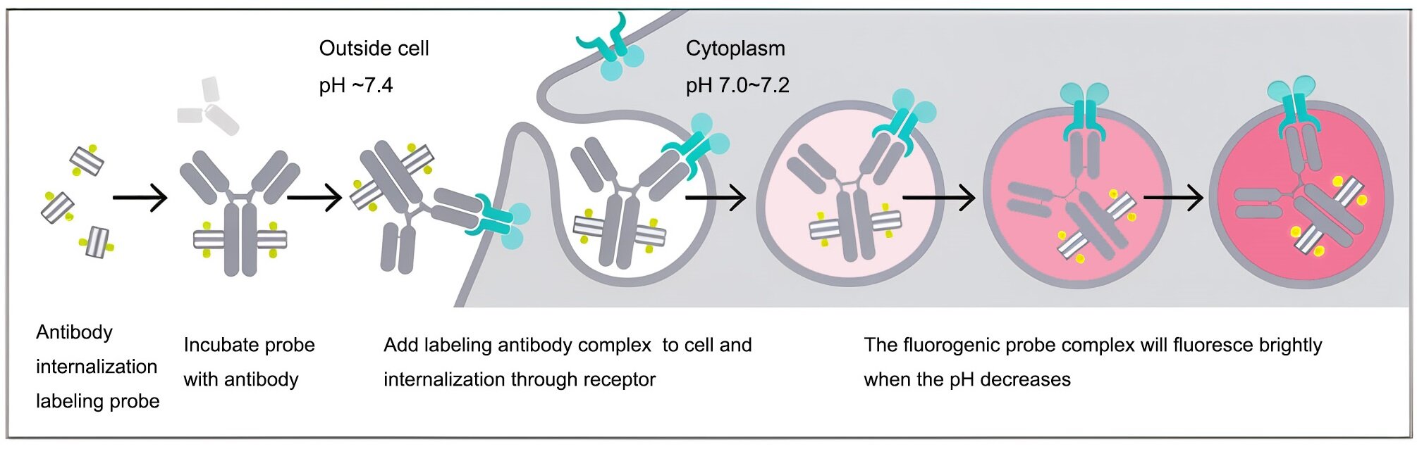 pH敏感型荧光染料的出现为解决上述问题提供了新思路。该类型染料在生理条件(pH 7.2-7.4)下荧光信号微弱,而在酸性环境(pH 4.5-6.0)中荧光强度显著增强。将此类染料与IgG偶联,可构建出一种“智能”探针,能够实时、动态地监测抗体进入细胞后的转运路径及酸化过程。其中,发射波长位于红光区的染料因其组织穿透力强、自发荧光干扰低等优势,成为活体成像与组织切片分析的优选。